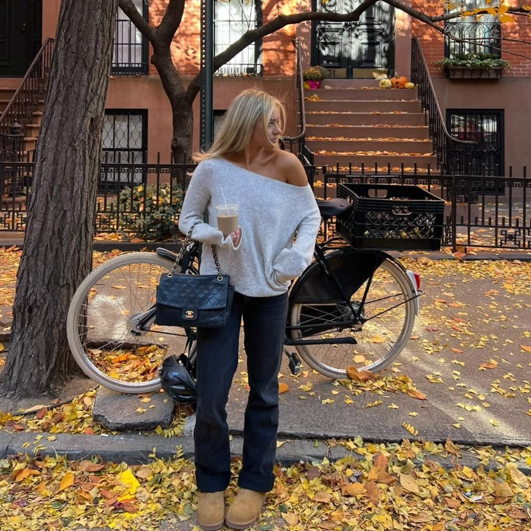 Elevate your wardrobe with the Slimline Elegance Sweater, a refined piece featuring an off-shoulder neckline...